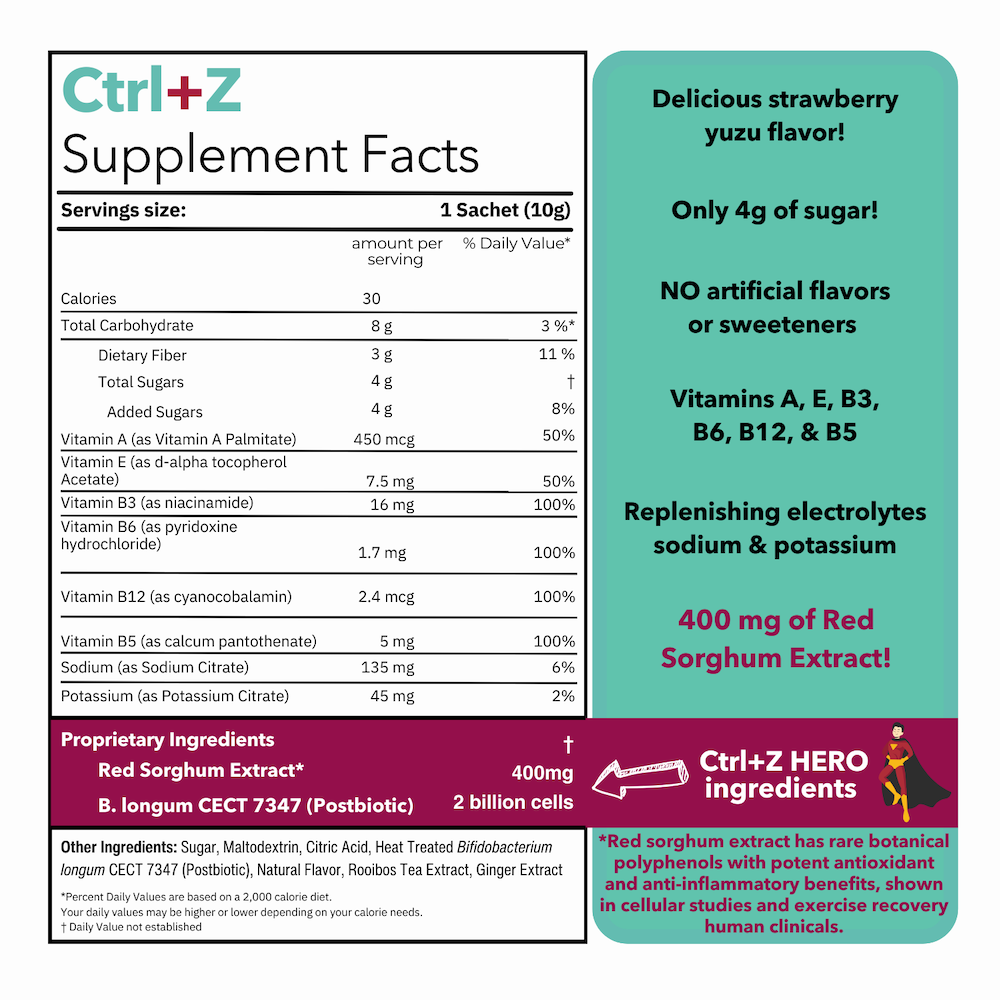 Researchers at the University of Kentucky developed a new, proprietary variety of red sorghum–a naturally occurring variant of traditional sorghum that is non-GMO, grown in the USA, and whose extract contains over 100 times the flavonoid content of typical botanicals. Long story short? It’s incredibly good for you. Each dose of Ctrl+Z includes 400mg of red sorghum extract, giving your body a boost of this powerful antioxidant and anti-inflammatory ingredient and helping you combat all the major effects of a night or day well-spent.