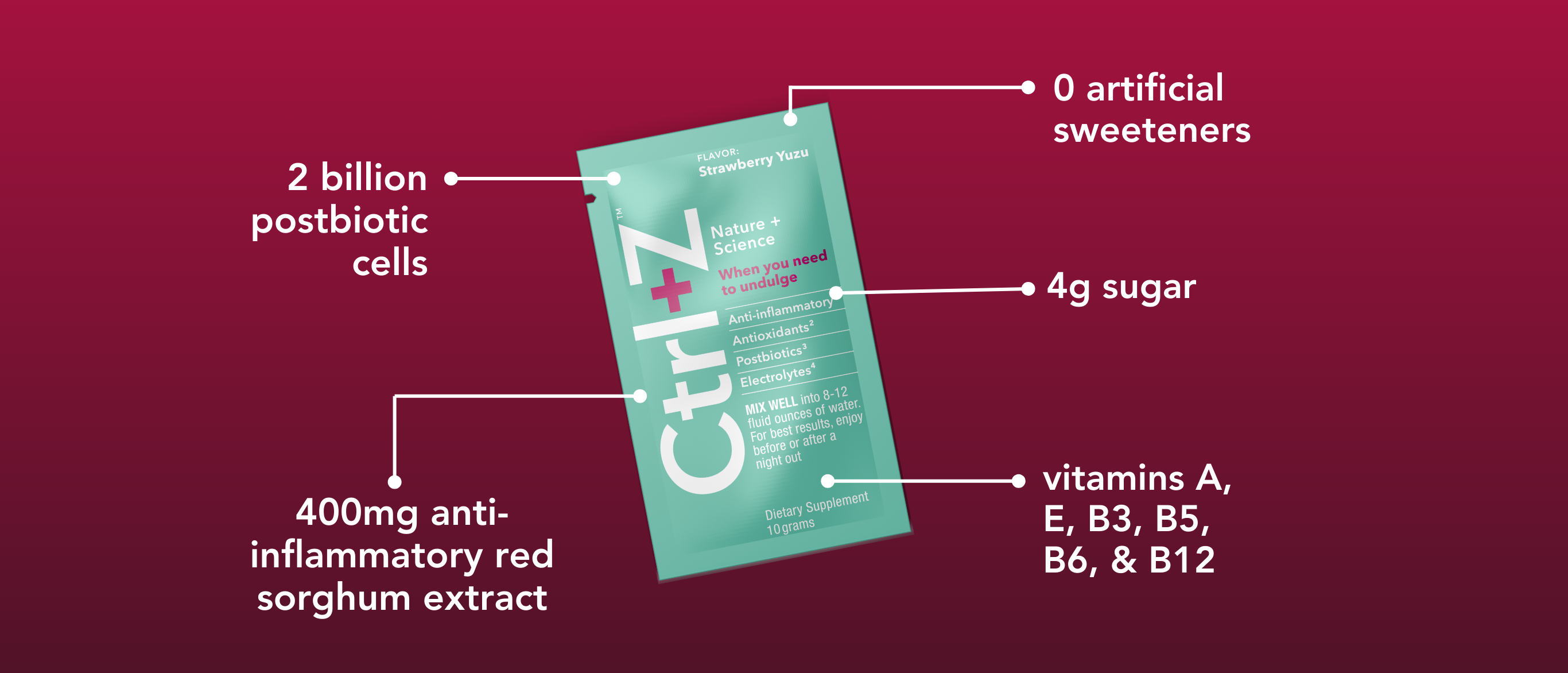 Normally, your body creates postbiotics by digesting both prebiotics and probiotics. That process can take days — days you don’t have. We wanted to create a supplement that provides relief when you need it. And we did. Ctrl+Z’s postbiotics cut right to the chase, delivering their benefits as quickly as possible. Ctrl+Z’s postbiotics make it one of the best drinks for gut health, restoring balance quickly and efficiently, helping you kick the hangxiety-induced stomach aches to the curb.